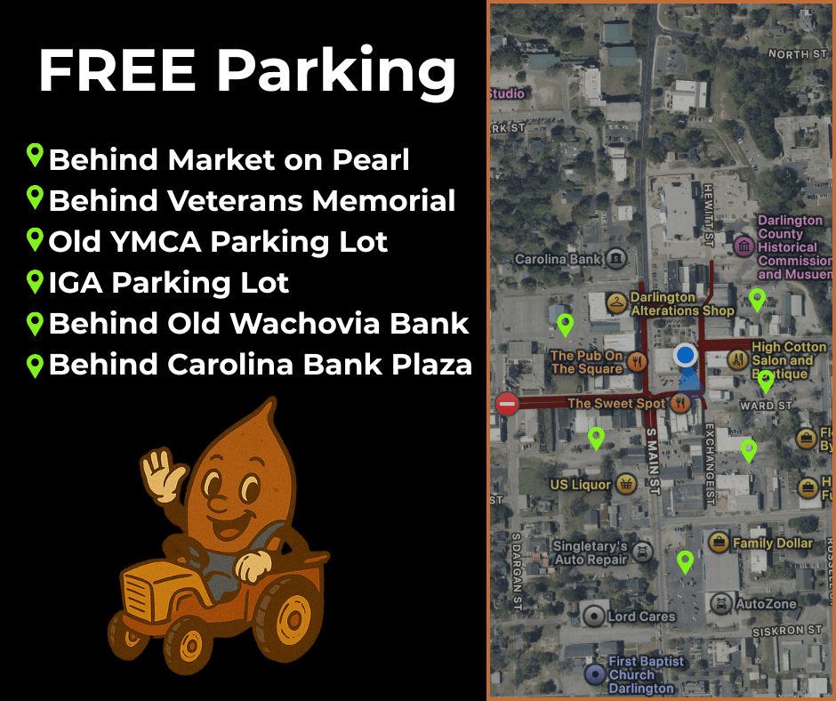 The festival takes up the Downtown Darlington Public Square, and the festival grounds are open from 10:00 a.m. until 4:00 p.m. The SC Sweet Potato Festival has FREE admission, and visitors are encouraged to park in one of the FREE parking locations located around downtown Darlington.